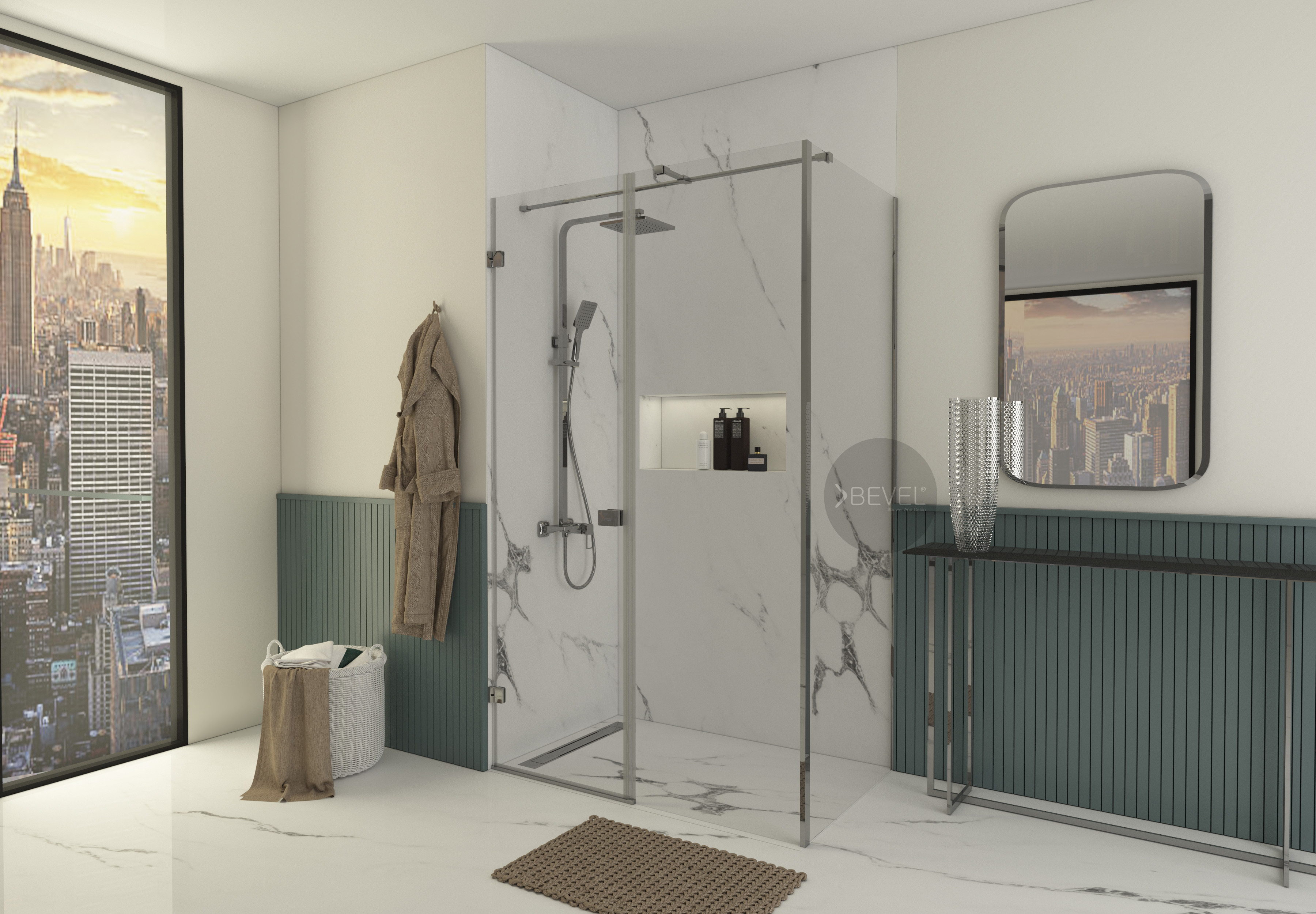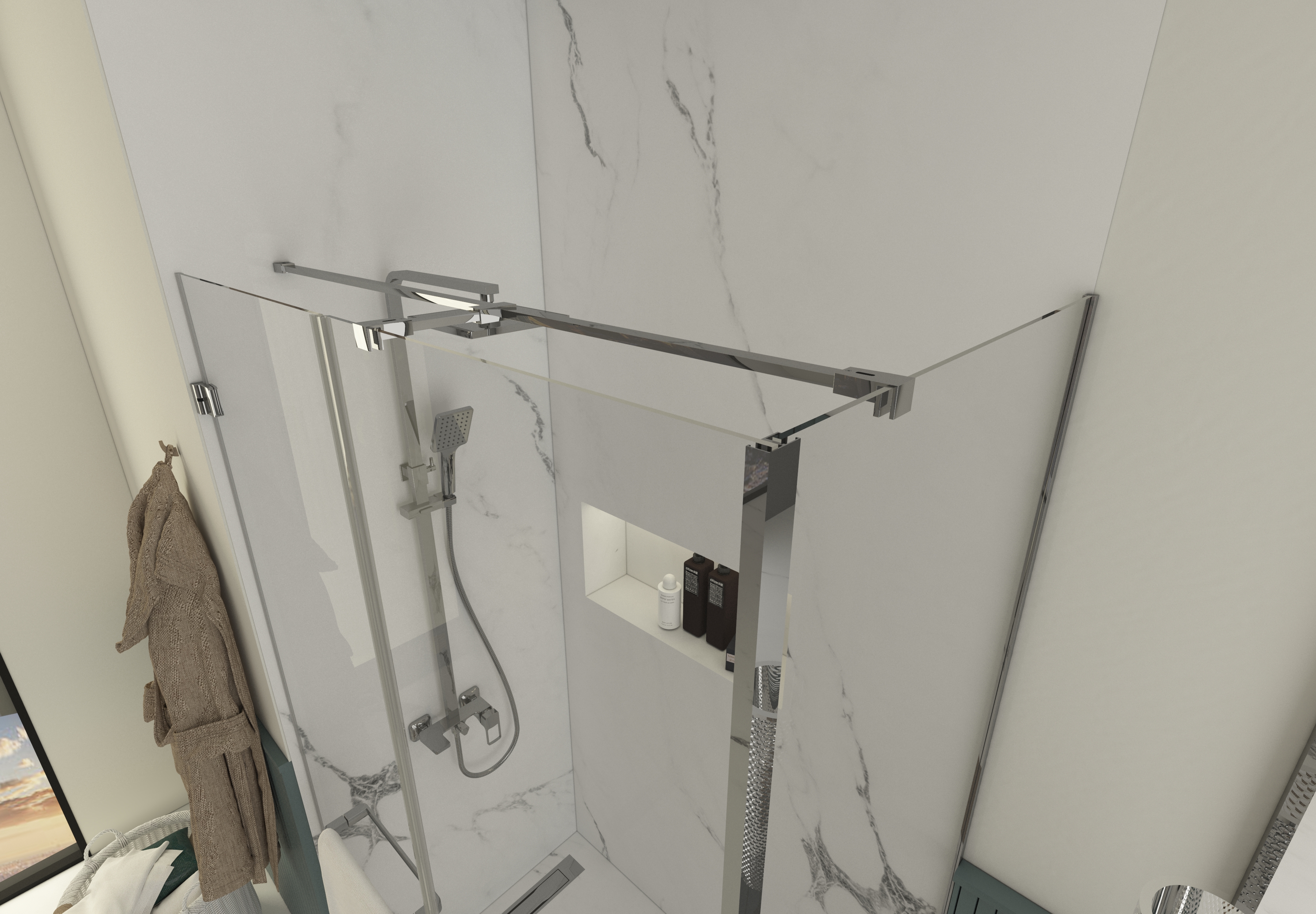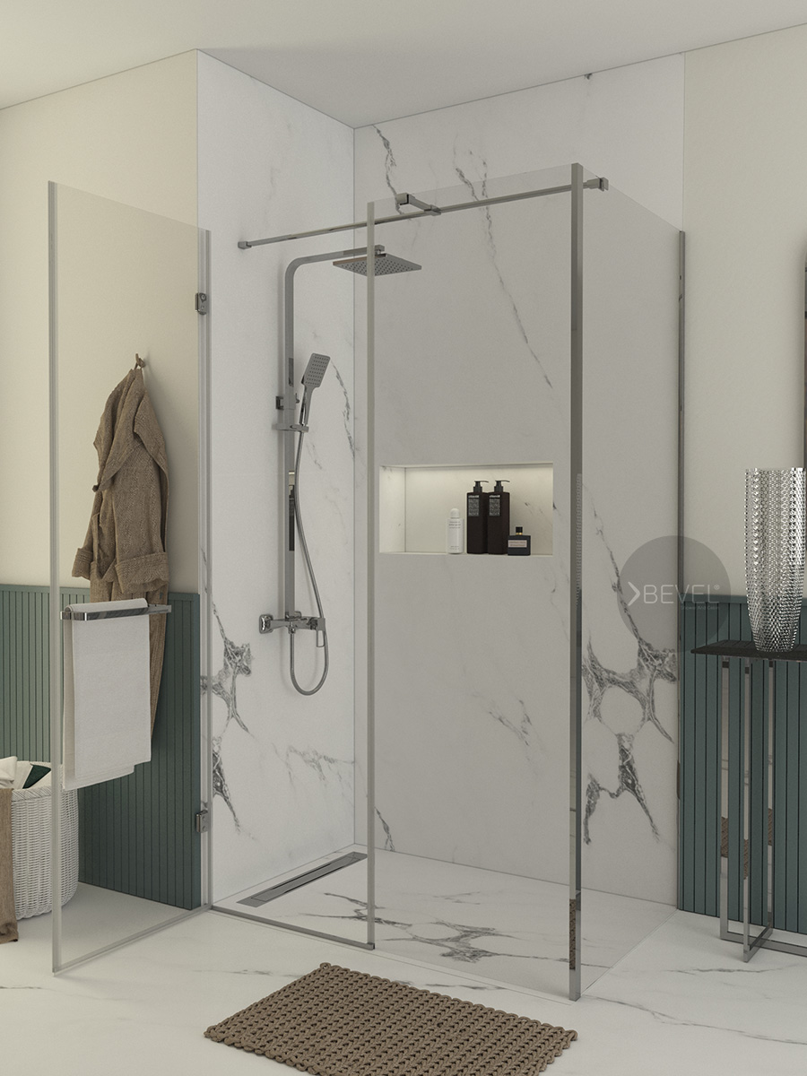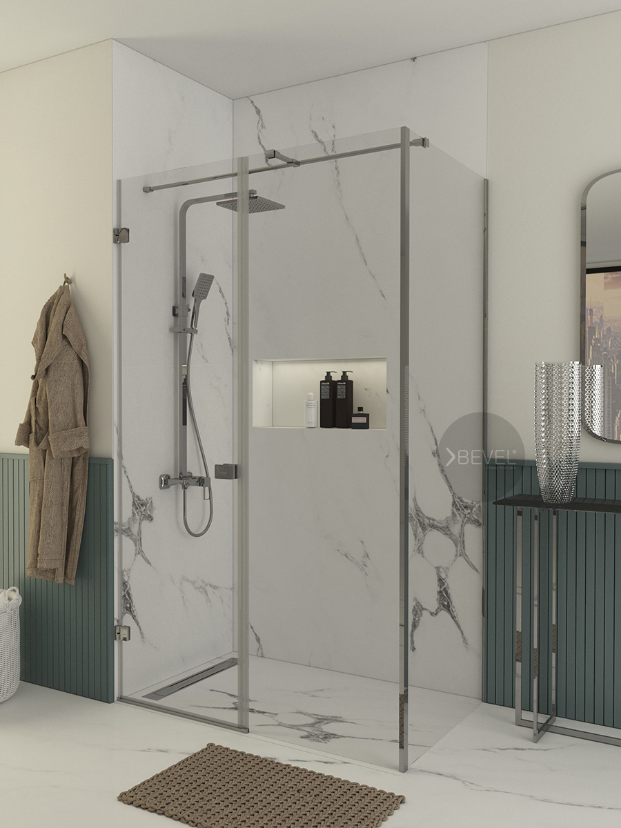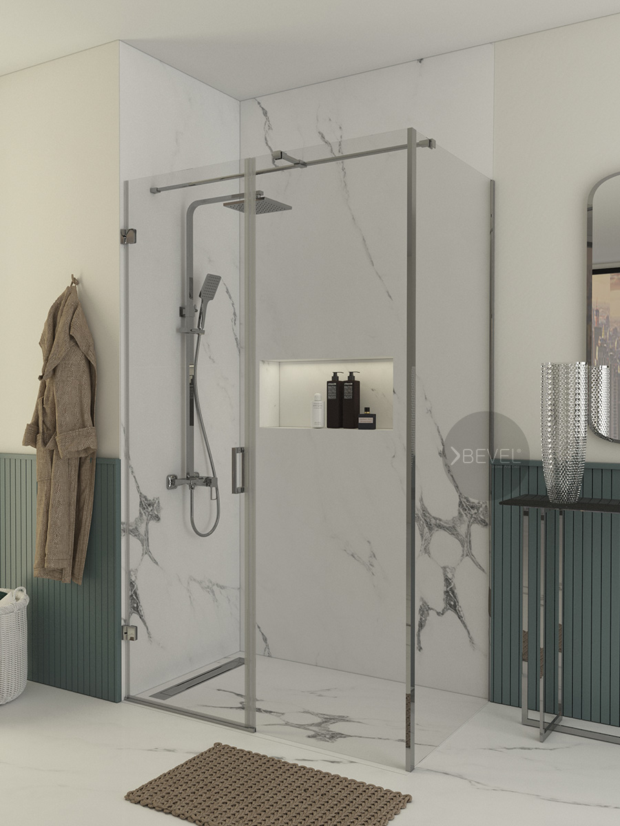 İki duvar arasında uygulanan bir sabit panel + açılır kapı sistemi, alan kaybını minimuma indirir. X2 yan panel ile desteklenen dikdörtgen form, duş alanını genişletir; su sıçramasını kontrol altına alırken banyoda daha ferah ve dengeli bir kullanım alanı oluşturur.