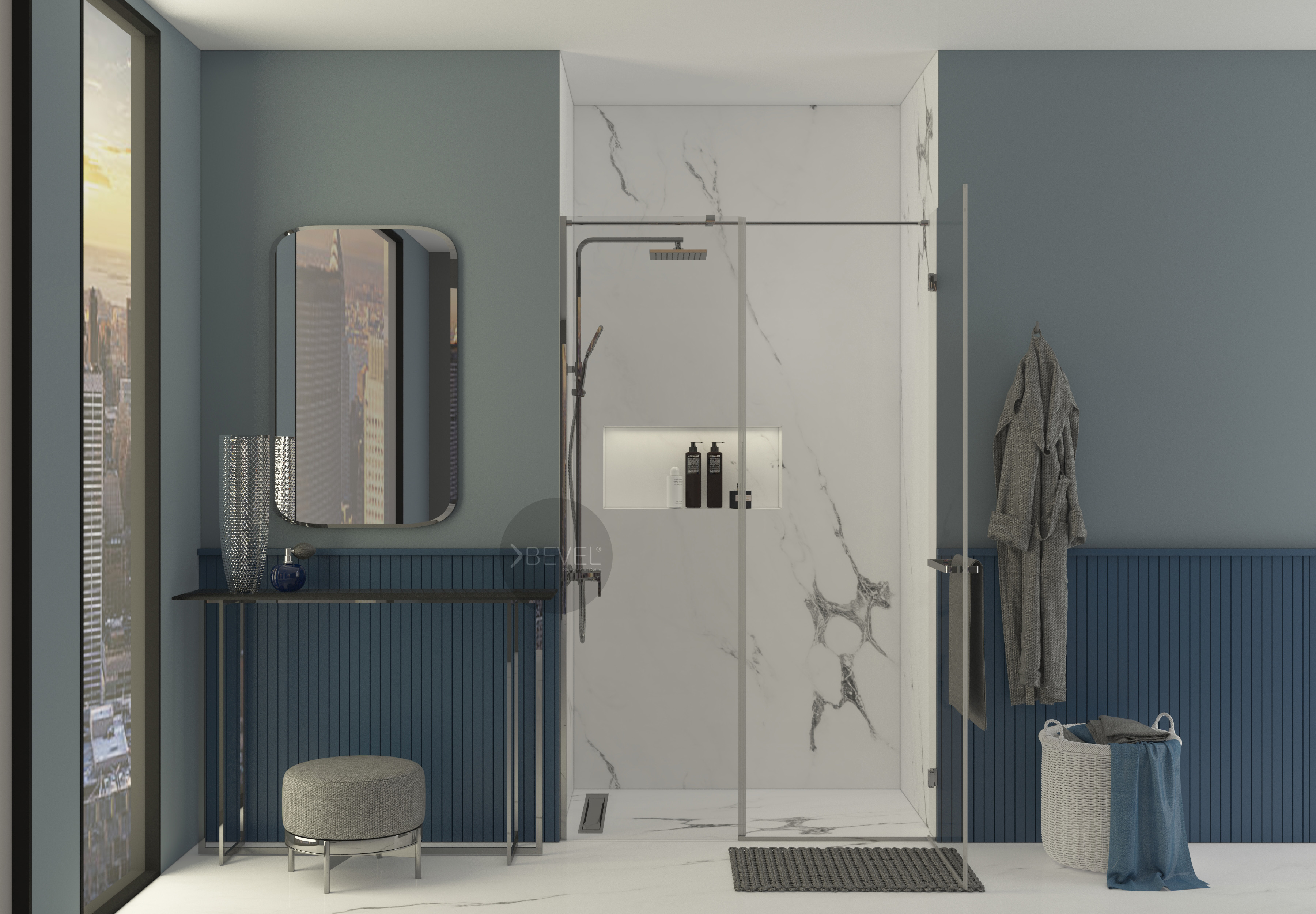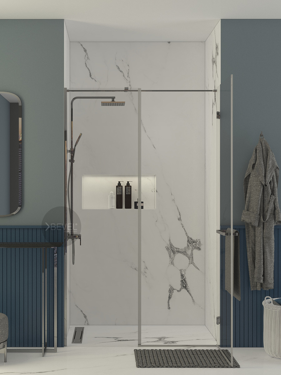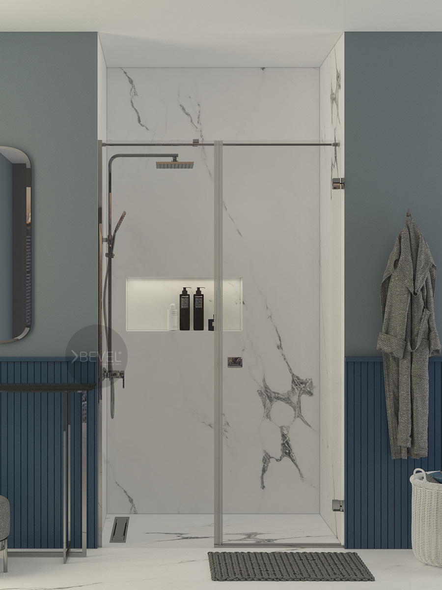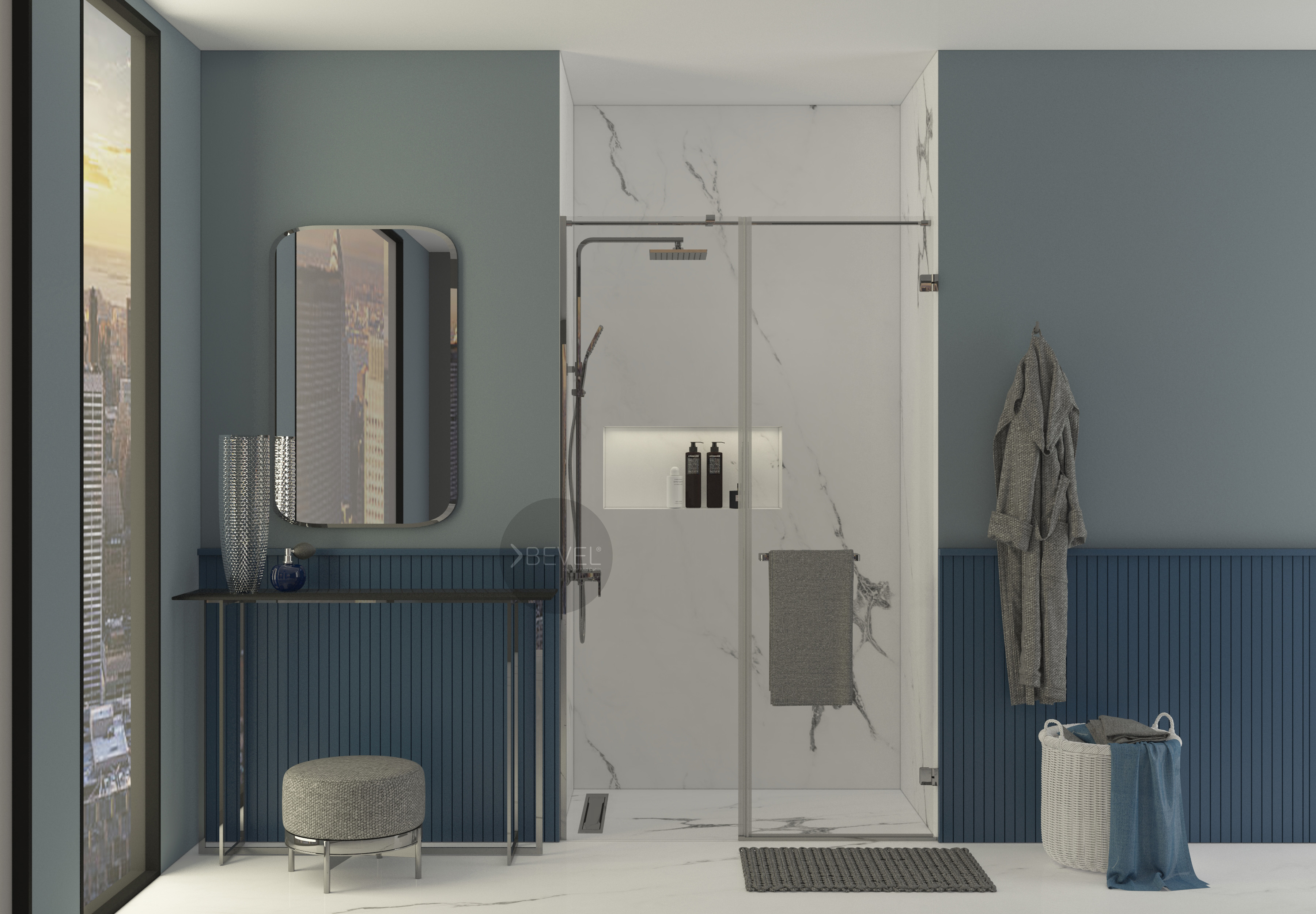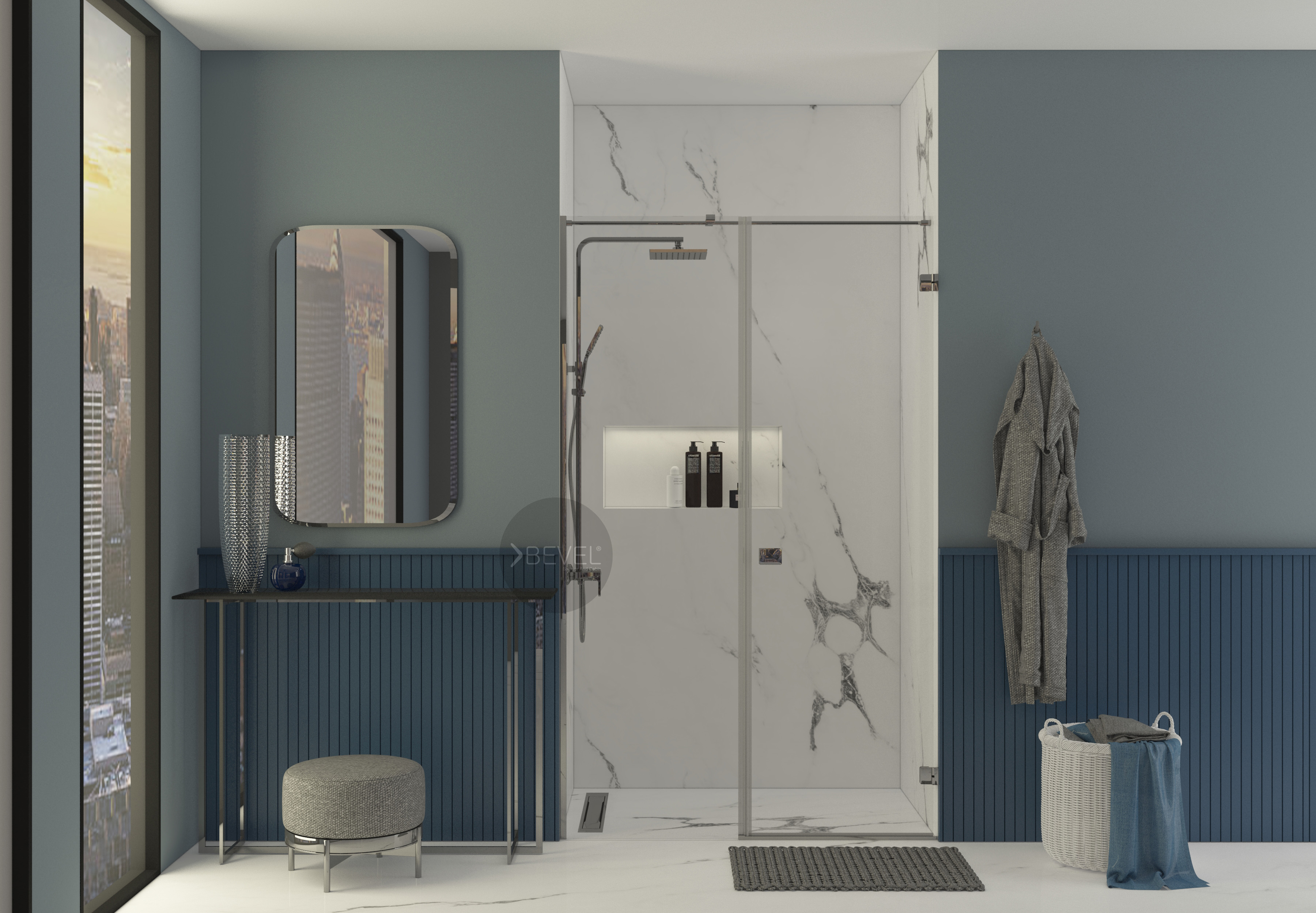 İki duvar arasında uygulanan bir sabit panel + açılır kapı sistemi, alan kaybını minimuma indirir. X2 yan panel ile desteklenen dikdörtgen form, duş alanını genişletir; su sıçramasını kontrol altına alırken banyoda daha ferah ve dengeli bir kullanım alanı oluşturur.