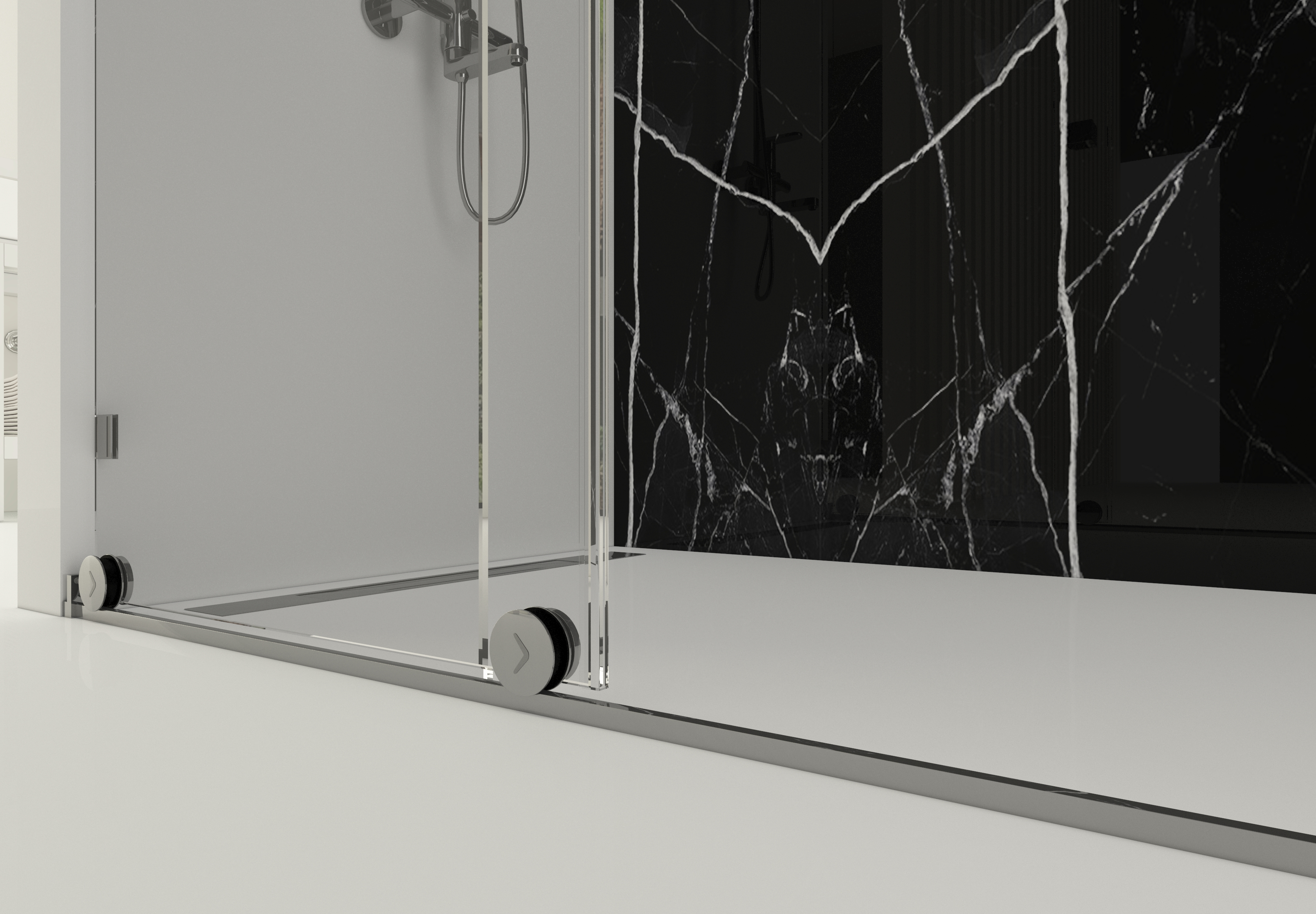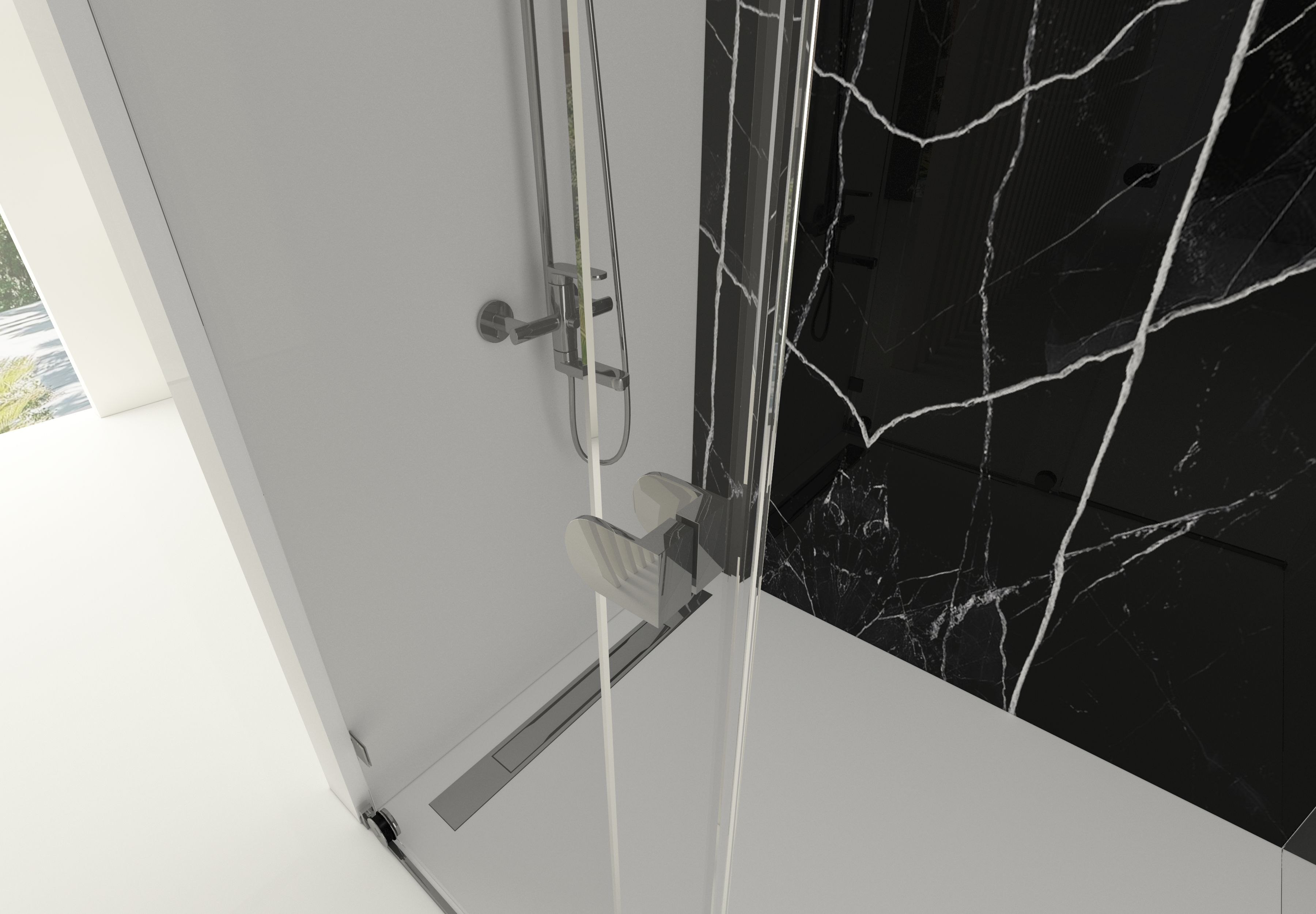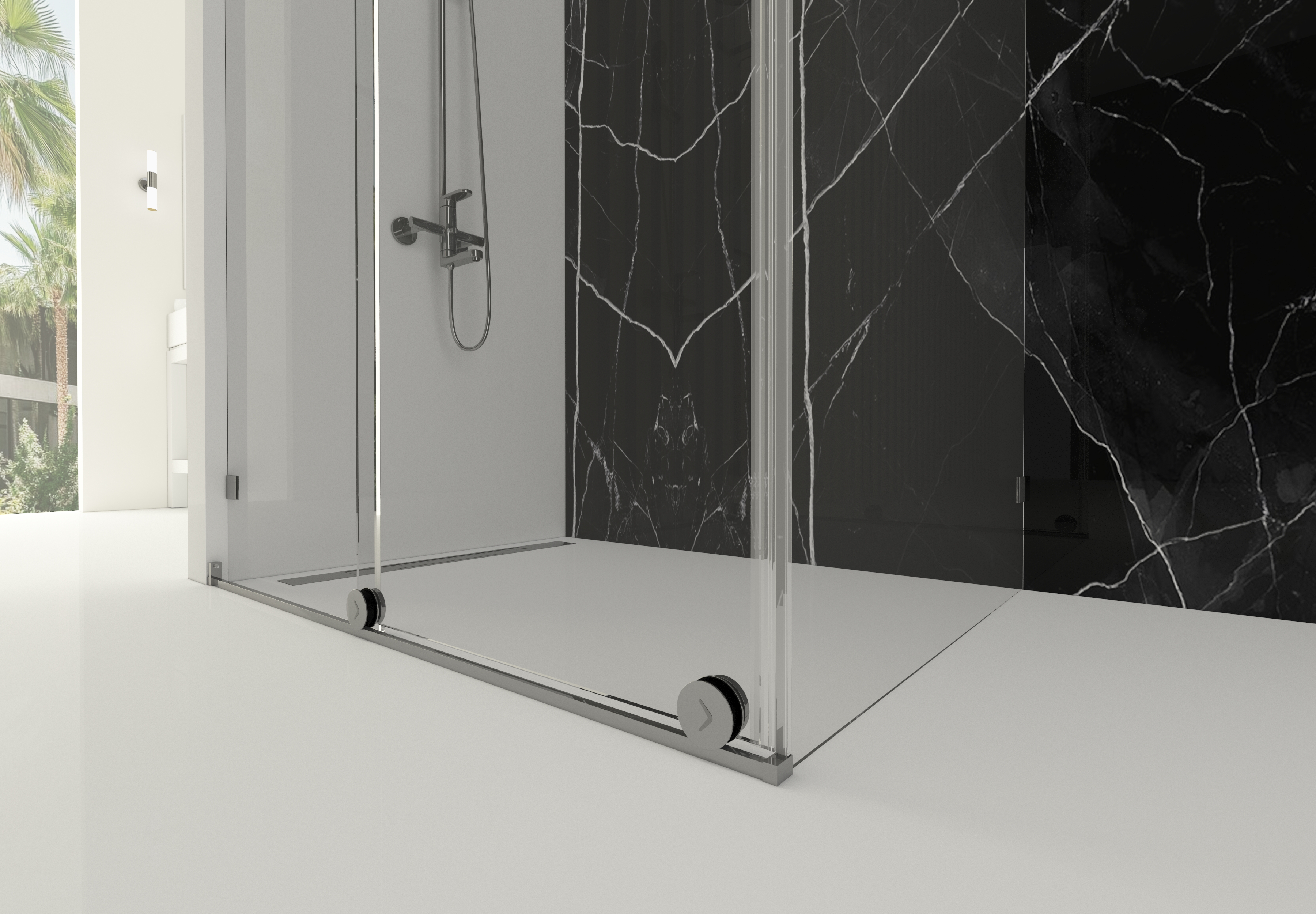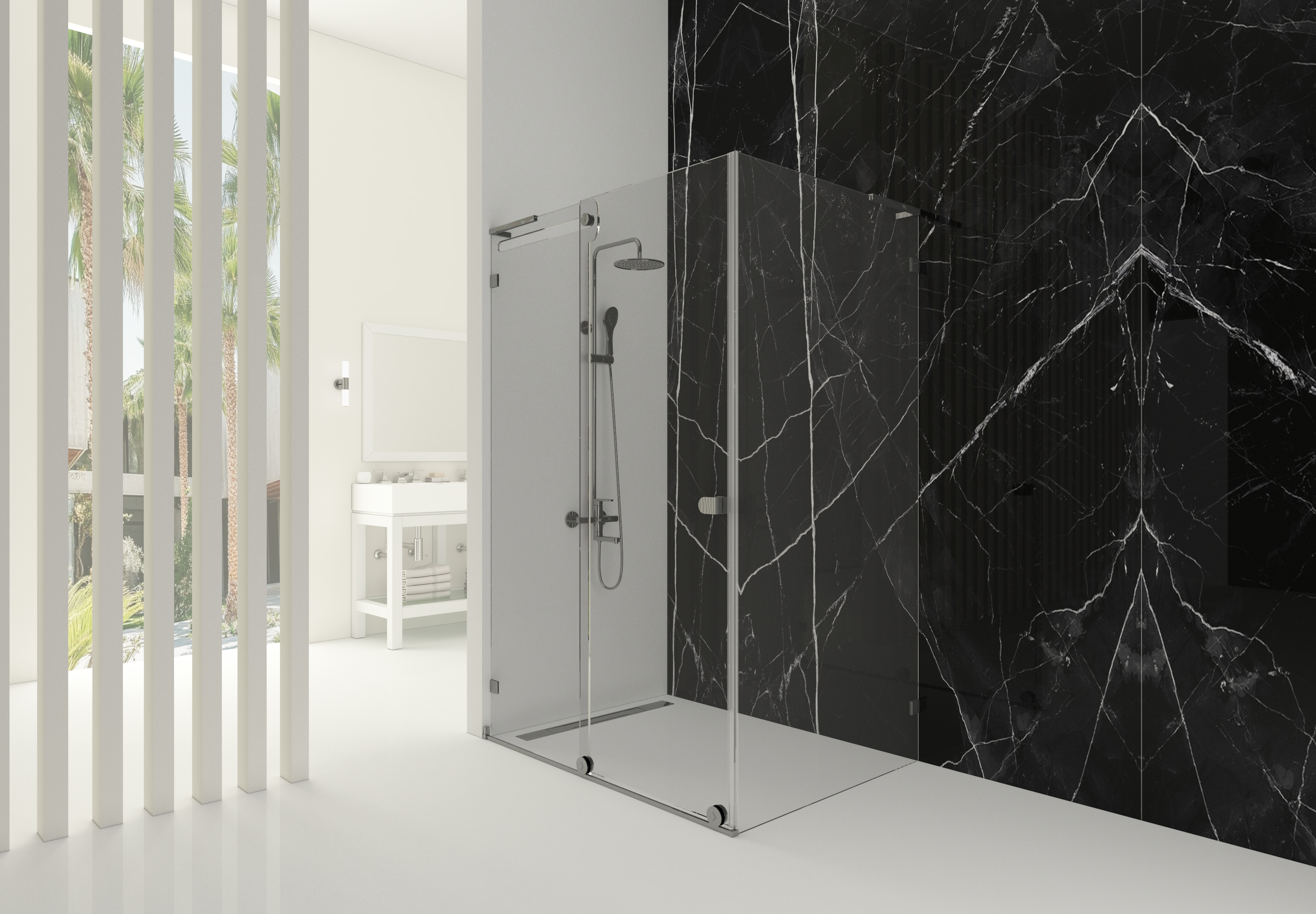 8 mm temperli ultra şeffaf cam, alan bütünlüğünü korur ve ışığın mekân içinde özgürce dolaşmasını sağlar. Neredeyse görünmez cam yüzeyler, banyoda sınır hissini ortadan kaldırarak mekânsal lüksü ön plana çıkarır.