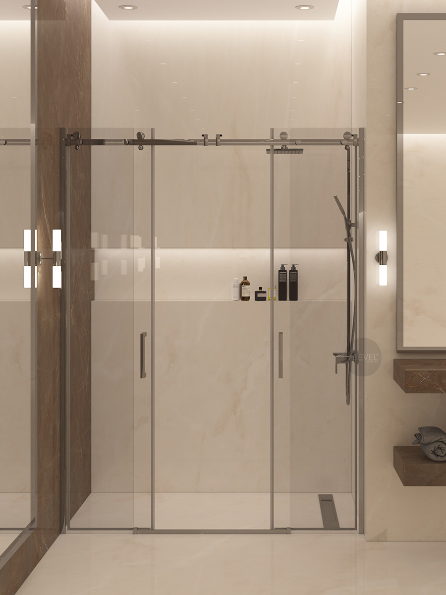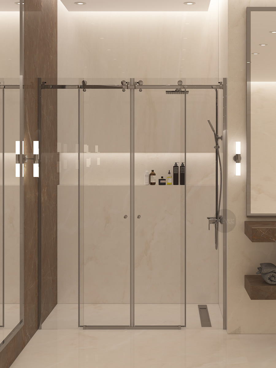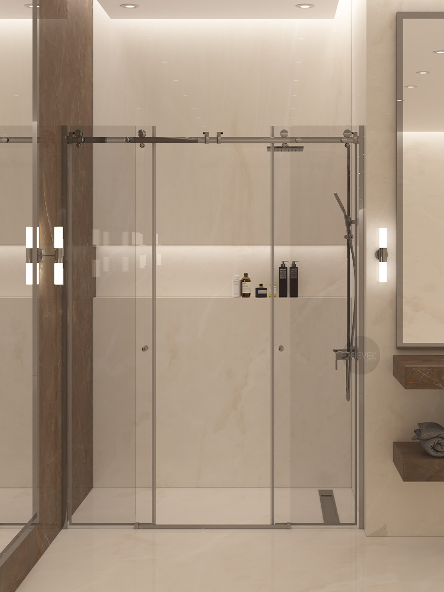 Sistemde; sağ ve solda konumlandırılmış 8 mm temperli sabit güvenlik camları, orta bölümde ise sağa ve sola açılabilen 8 mm temperli kayar camlar yer alır. Bu yapı, banyoların her iki duvarında engeller bulunan alanlarda dahi geniş ve rahat bir giriş açıklığı sağlayarak konforlu bir kullanım deneyimi sunar.