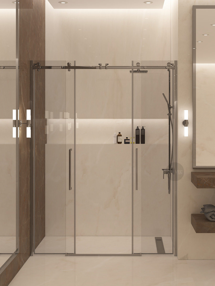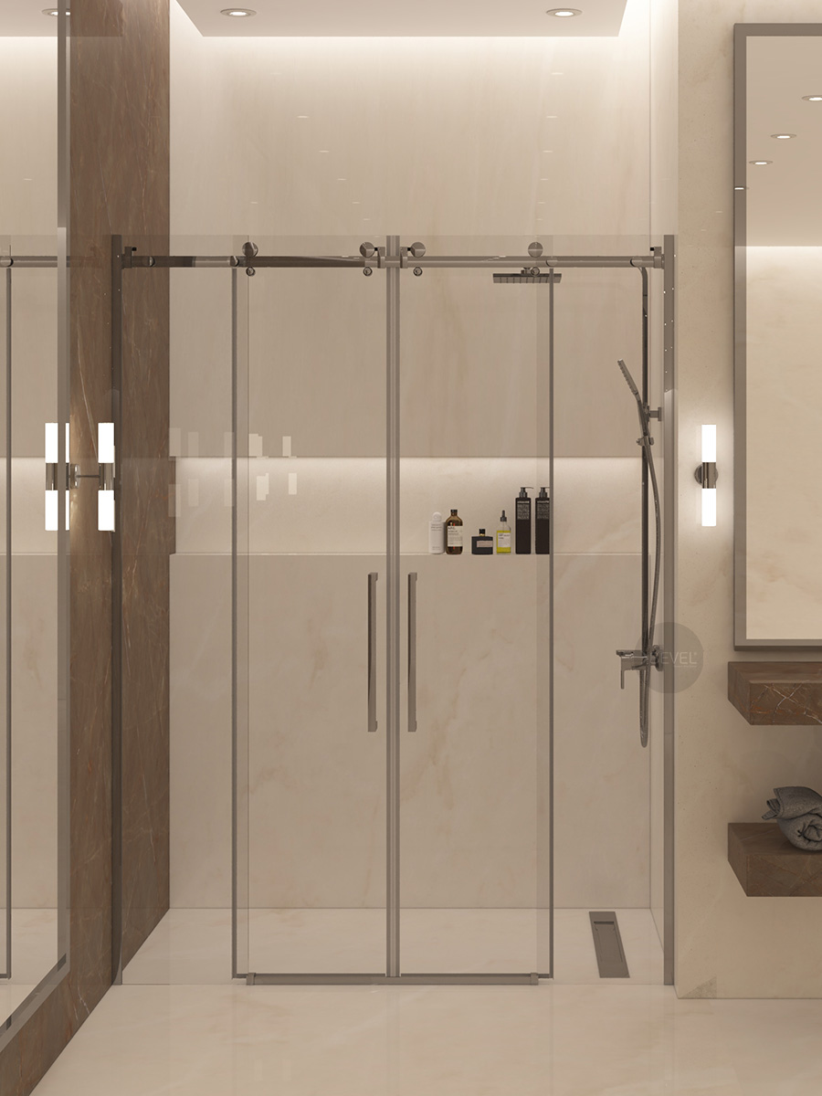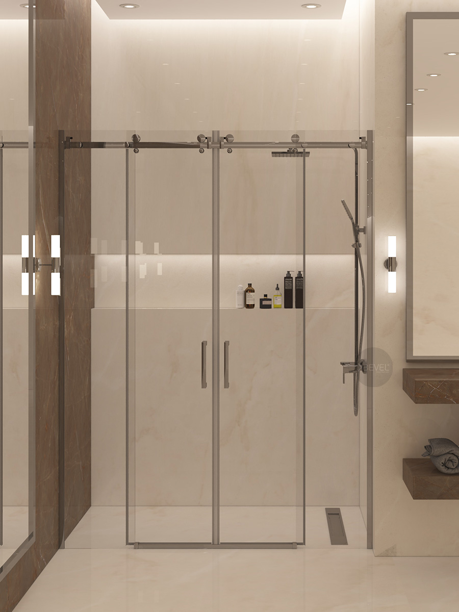 Sistemde; sağ ve solda konumlandırılmış 8 mm temperli sabit güvenlik camları, orta bölümde ise sağa ve sola açılabilen 8 mm temperli kayar camlar yer alır. Bu yapı, banyoların her iki duvarında engeller bulunan alanlarda dahi geniş ve rahat bir giriş açıklığı sağlayarak konforlu bir kullanım deneyimi sunar.